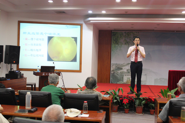 7月17日下午,医院眼底外科主任、副主任医师郑斌应苏州市图书馆《健康大讲坛》的邀请,在图书馆第一报告厅为市民做题为《糖尿病性视网膜病变》的科普演讲。活动吸引了近130多位中老年听众前来听讲。