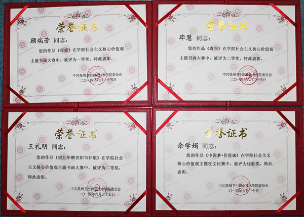 眼视光医院的职工们在此次书画、绘画比赛中取得了优异的成绩。期中顾瑞芳的作品《母爱》在书画大赛绘画作品中荣获一等奖;毕慧作品《寄兴》、王礼明的作品《望九华赠青阳韦仲堪》在书画大赛书法作品中荣获二等奖;余学娟的作品《中国梦-价值魂》在征文比赛中荣获优胜奖,向获奖的职工表示热烈的祝贺!(院办 文/余学娟  图/张国娟)