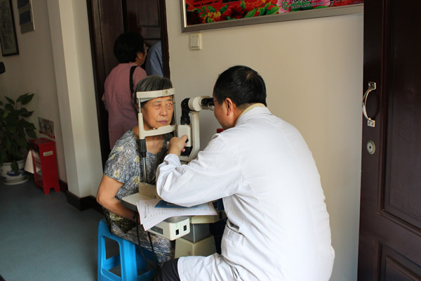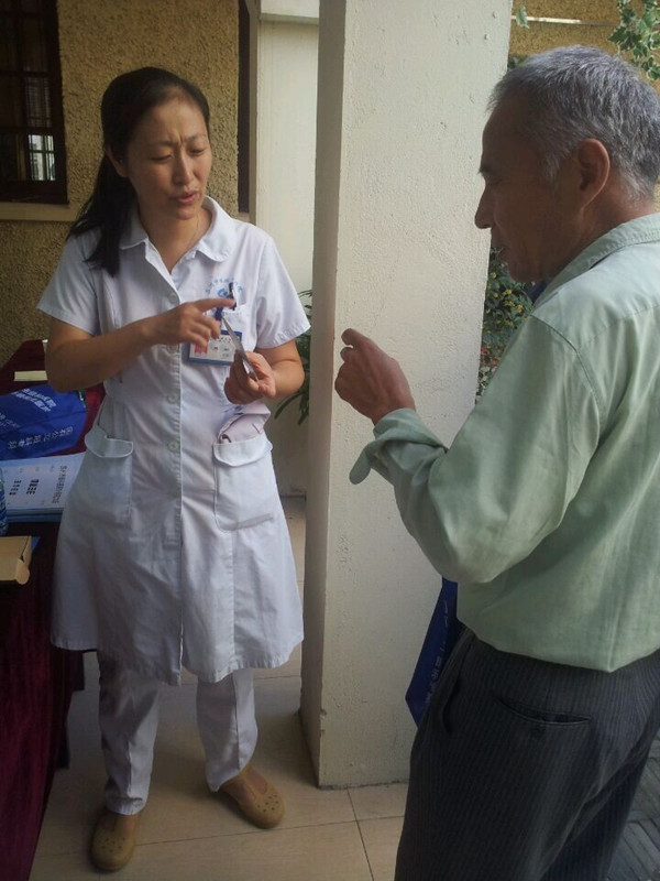 在活动现场,老人们前来咨询白内障、眼睛流泪、看不清楚等问题,医务人员耐心细致的一一解答,医生在裂隙灯下为眼睛有异状的老人做检查,对于需进一步检查的居民,医生建议他们到医院做详细的检查。一位老人拿着我们赠送的阿姆斯勒方格自查表,惊喜的说,“这个在中央电视台上讲过的,是检查眼睛的,但是我一直没找到,没想到你们送给了我们,很好啊!”他很开心的询问使用方法,护士长陈娟向老人详细介绍了使用的步奏、如何在家自查等等。短短一个小时,医疗队为到社区参加重阳节活动的老人们筛查了眼睛,并为每位老人都赠送了眼保健宣传手册。