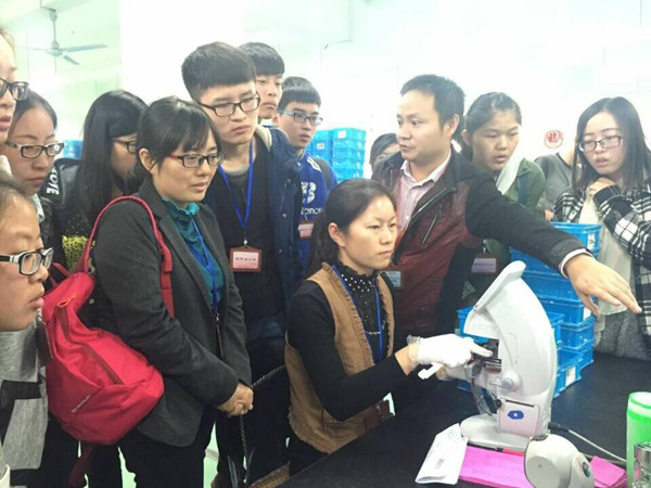 根据示范校建设的目标要求,为了深化教学改革,推进“工学结合”的人才培养模式,加快职业教育人才培养模式由传统的以学校和课程为中心向工学结合、校企合作转变,探索职业教育人才培养的新模式。2015年11月2日3日,眼视光系视光教研室部分教师及2014级眼视光技术专业学生,分两批到江苏淘镜眼镜有限公司(丹阳)参观学习。