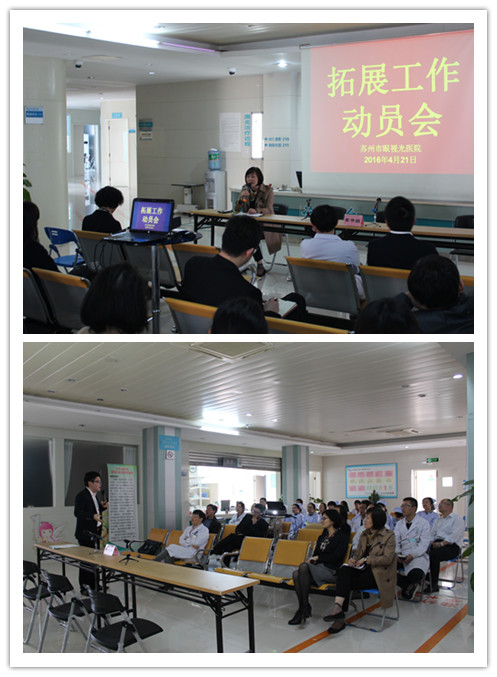 为了进一步开展好2016年社区白内障筛查活动,提高眼视光医院白内障拓展人员的服务质量及水平,近日,附属眼视光医院在二楼大厅召开白内障拓展工作动员会,沈丽君院长、丁旭红书记、李国星副院长及全院职工参加了会议,会议由李国星副院长主持。