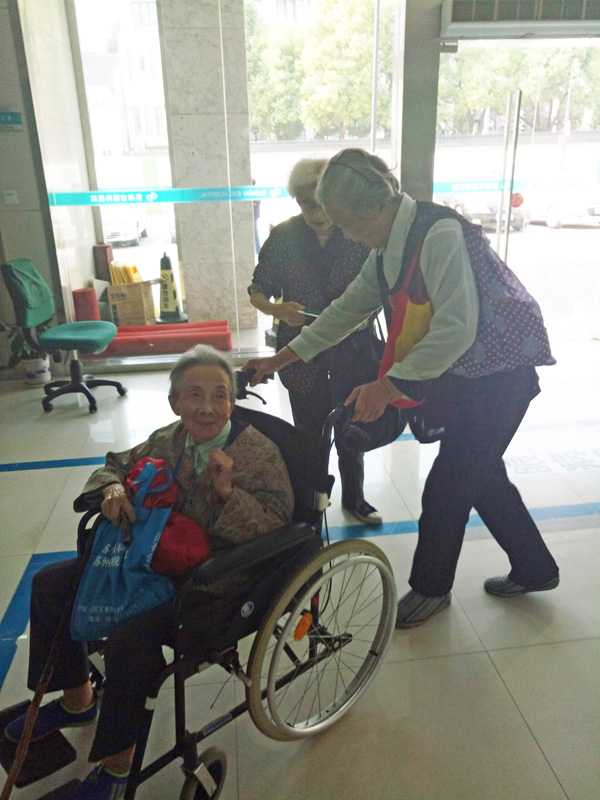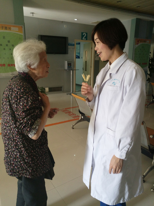 三个行动不便的老人来医院就诊,其中一位老人坐在轮椅上,一位白发苍苍的老人推着轮椅。正在行政检查的黄小琼副院长见状,就走上前去帮他们把轮椅推上了台阶,老人很受感动,把佩戴在自己胸前的玉兰花送给了黄院长。老人说:“我也是一位老医生,你们医院的服务很好,谢谢您,您就像这花儿一样美!”