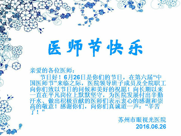 为了向长期以来一直在平凡岗位上默默坚守,为苏州市眼视光医院发展付出辛勤汗水、做出积极贡献的医师们表示感谢,6月26日在第六届“中国医师节”来临之际,眼视光系(眼视光医院)党总支书记丁旭红、副院长贾松代表医院领导班子成员开展了“医师节”慰问活动。