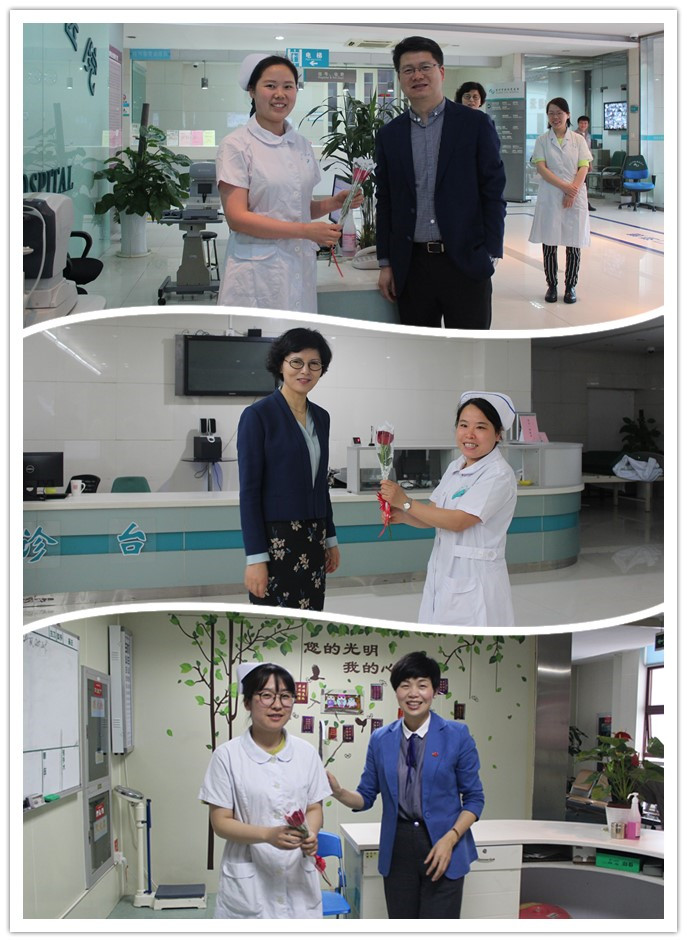 一大早,院领导们一行带着精心准备的礼物和鲜花,从一楼视光分诊台、二楼眼病分诊台、护士办到三楼病房护士站,走访了每个坚守在临床一线的护士们并为她们献上鲜花及节日的慰问,把最真诚的祝福送给了眼视光最可爱的天使们。