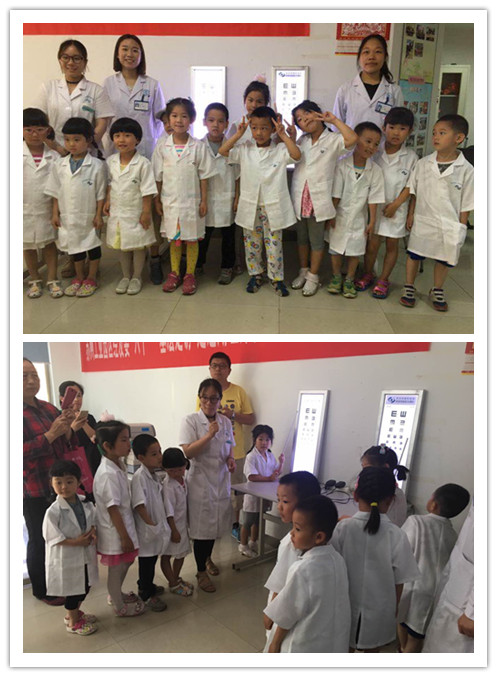学习完成后,“小小眼科医生”们就要上岗了,他们身穿白大褂,眼盯视力表,别看小朋友们的年龄小,个子矮,可他们工作起来可一点都不含糊。“眼睛要看着里面中间的小房子,眼睛不能转哦。”在电脑验光仪前,“小小眼科医生”们在医务人员的帮助和指导下,为其他小朋友以及自己爸爸妈妈进行验光。