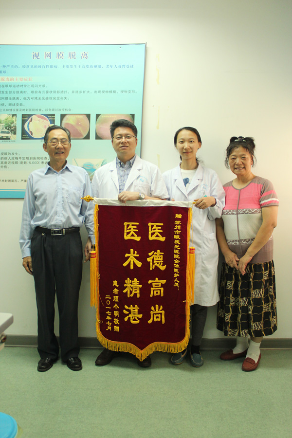 顾先生近两年来视力逐渐下降,已经严重影响平时生活,之前在外院看过,诊断为双眼白内障,右眼病情更重一点,且同时患有双眼上睑下垂。后来到我院就诊,李国星副院长和张姗姗医生为他的病情制定了详细的方案。术后,顾先生明显感觉视力有所提高,一星期后复查右眼视力从原来的0.1提高到0.8,顾先生感到非常高兴,感谢苏州市眼视光医院的医护人员不仅让他重新看清这个世界,也改变了他的生活。为表示感谢,他特送来锦旗。
