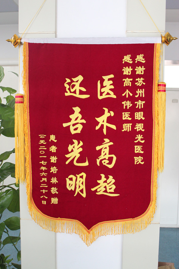 为感谢苏州市眼视光医院为自己带来光明而送来锦旗的还有一位患者。谢先生几个月前在外院做了双眼白内障手术,近一个月感觉视力又逐渐下降。经高小伟主任检查后,发现谢先生双眼都有后发性白内障,建议激光治疗。谢先生听从了高主任的建议,术后,双眼视力明显得到提高,由之前的右眼0.2,左眼0.3恢复到了右眼0.6,左眼0.8。谢先生感到非常开心,故送来了锦旗以表对高小伟主任的感激之情。