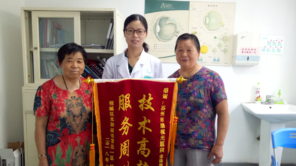 7月5日上午,一位穿着美丽旗袍的阿姨带着一名患者来到护士站,把一面绣有“服务周到、技术高超”的锦旗送到顾丽萍医生手中,以表示对眼视光医院全体医护人员的感谢。