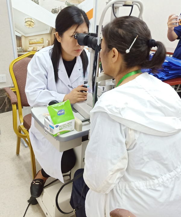 讲座结束后,便开始了眼科健康筛查活动,崔医生便为每一位叔叔阿姨进行了较为细致的眼表和眼底检查。其中有一位阿姨说自己得了翼状胬肉,曾到药店看过了,老板只是说点点药水就会好了,但现在没有变好,反而视力越来越差了。经过崔医生检查后得知,阿姨确实得了翼状胬肉,但是仅仅滴药水是不可能痊愈的。翼状胬肉是局部球结膜及其下纤维血管组织呈三角形膜样增生向角膜中心生长的一种赘生组织,形状似昆虫翅膀,可因侵犯角膜而严重影响视力。关于该病的治疗,手术切除是目前的主要治疗方法,药物治疗只是辅助,可缓解翼状胬肉所引起的局部症状,术后使用眼药水还可以减少复发可能。另外,目前市面上大多数眼药水中都含有防腐剂,防腐剂有毒副作用,可以引起干眼症、结膜炎,严重的话可以引起角膜炎,甚至导致失明。因此,日常生活中,当感觉眼睛不舒服时,最好到医院就诊,经过专业医生检查诊断后,再决定是否使用眼药水。