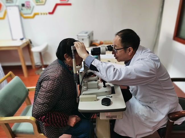 2019年12月11日,附属眼视光医院曹志杰医生带领公益医疗团队前往青剑湖社区的龙会日间照料中心开展眼科健康讲座和筛查,为中心的老人们讲解老年人常见眼病并检查眼睛。