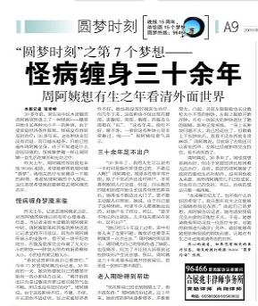 周阿姨说, 30多年了,她也曾想将病治好,但由于家庭经济比较困难无法治疗。目前,独居的周阿姨除了政府的最低生活补贴外,没有其他收入来源。虽然周阿姨的儿子已经成家,但也有自己的负担。所以,治病的想法只能一拖再拖。“本来嘛年纪大了,也不抱什么治好的希望了,我只想在有生之年能够让眼睛看得见东西。”谈起自己的梦想,周阿姨告诉记者,她考虑到怪病完全治愈的可能性不大,于是,她想请晚报帮助寻找一位医疗专家,对她的病情进行确诊;另外,最好能够帮她把影响视线的肿块治愈,让她在有生之年还能看清外面的世界。
