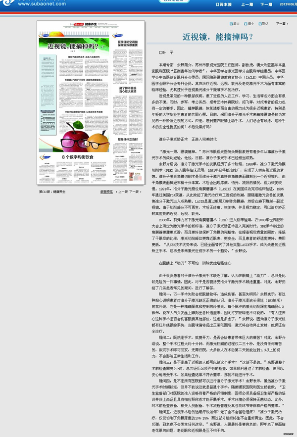 “激光一照,眼镜摘掉。”苏州市眼视光医院余野副教授有着多年从事准分子激光手术的成功经验。他说,目前,准分子激光手术已经相当成熟。