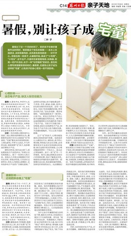 暑假过了近一个月的时间了,很多孩子在做好暑假作业的同时,畅享着这个快乐的假期——去水上乐园游泳、去影院看电影、去风景名胜地旅游……好不开心。但是也有一些孩子,从暑假开始,就成了“小宅男”、“小宅女”,足不出户,只喜欢在家里看电视、玩电脑,拒绝一切户外活动,处于一种“与世隔绝”的状态。医生和心理专家提醒爸爸妈妈们,暑假里,应避免让孩子成为这样的“宅童”,以免孩子的身心受到一些不良影响。