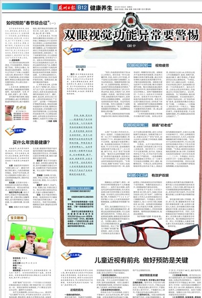 牛燕说,从平日就诊情况来看,双眼视门诊的患者以青少年及上班族居多。他们的学习、工作离不开近距离用眼,如书本、电脑及各种电子产品,在不知不觉中对眼睛造成了严重负担。一些患者裸眼或者戴镜视力非常好,可一旦看书写字就会出现模糊、串行、重影、眼酸等症状。牛燕认为,如果这种双眼视异常出现在孩子身上,那就会因为眼睛容易疲劳、注意力无法集中而影响学习。同时,这种眼部问题往往容易误诊,久而久之就会影响眼睛的调节和集合功能。“其实,对于这类视功能异常,可以经过规范的检查确诊并制订个性化的视功能训练计划,通常训练的效果非常理想。”牛燕说,规范的全面视功能检查需要20-30分钟,目前眼视光医院的双眼视门诊时间为每周一、二、三上午。牛燕建议,平时生活和学习中一定要注意用眼卫生,不可长时间持续用眼。同时应注意营养均衡,一旦出现眼睛不舒服或视物模糊,应及时就医检查。