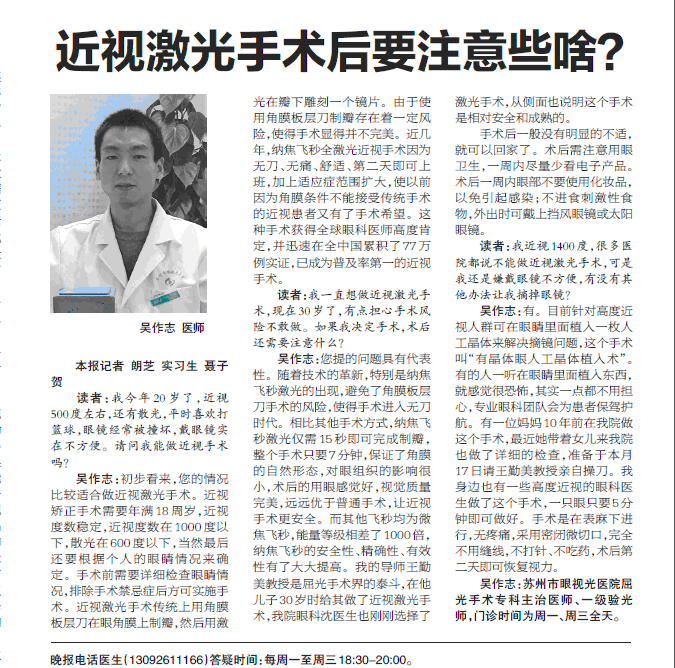 吴作志:苏州市眼视光医院屈光手术专科主治医师、一级验光师,门诊时间为周一、周三全天。