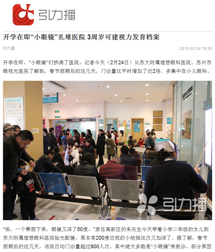 开学在即,“小眼镜”们挤满了医院。记者今天(2月24日)从苏州市眼视光医院了解到,春节假期后的这几天,门诊量比平时增加了近2倍,多集中在小儿眼科。