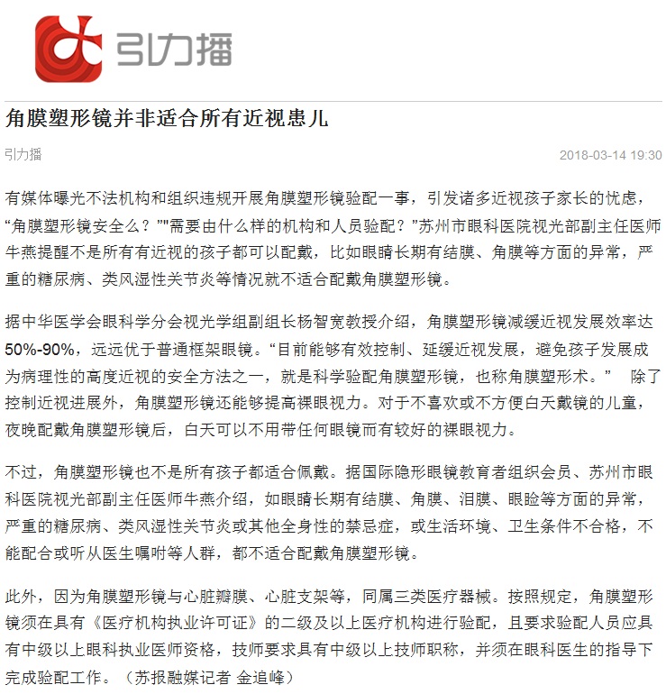 有媒体曝光不法机构和组织违规开展角膜塑形镜验配一事,引发诸多近视孩子家长的忧虑,“角膜塑形镜安全么?”"需要由什么样的机构和人员验配?”苏州市眼科医院视光部副主任医师牛燕提醒不是所有有近视的孩子都可以配戴,比如眼睛长期有结膜、角膜等方面的异常,严重的糖尿病、类风湿性关节炎等情况就不适合配戴角膜塑形镜。