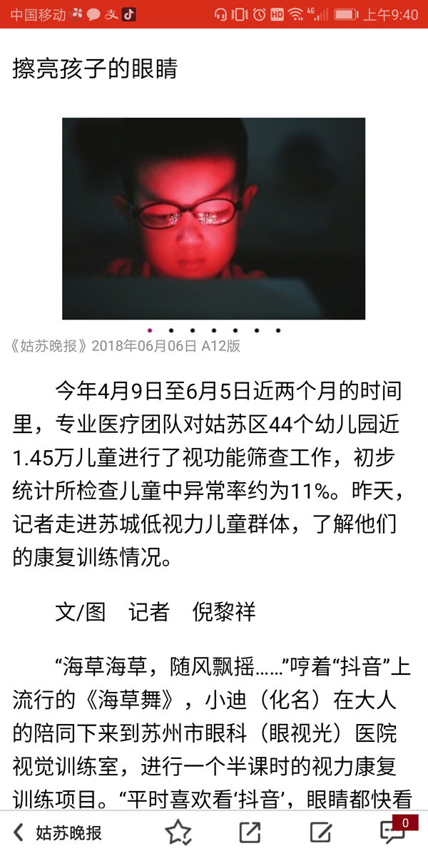 今年4月9日至6月5日近两个月的时间里,专业医疗团队对苏州姑苏区44个幼儿园近1.45万儿童进行了视功能筛查工作,初步统计所检查儿童中异常率约为11%。今天(6月5日),记者走近苏城低视力儿童群体,了解他们的康复训练情况。