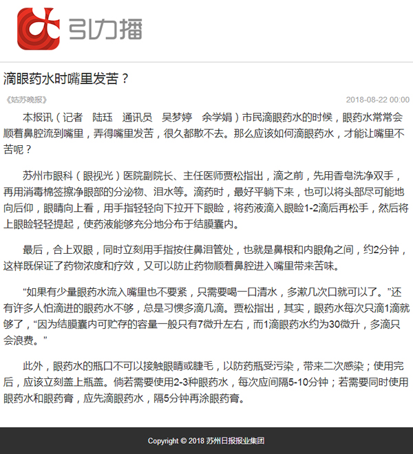 “如果有少量眼药水流入嘴里也不要紧,只需要喝一口清水,多漱几次口就可以了。”还有许多人怕滴进的眼药水不够,总是习惯多滴几滴。贾松指出,其实,眼药水每次只滴1滴就够了,“因为结膜囊内可贮存的容量一般只有7微升左右,而1滴眼药水约为30微升,多滴只会浪费。”