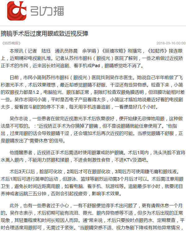 本报讯(记者 陆珏 通讯员陈晨 余学娟)《延禧攻略》刚播完,《如懿传》接连跟上,近期精彩电视剧扎堆。记者从苏州市眼科(眼视光)医院了解到,一些之前做过近视矫正手术的市民,近来因长时间追剧、看手机或Pad,眼睛感觉吃不消了。