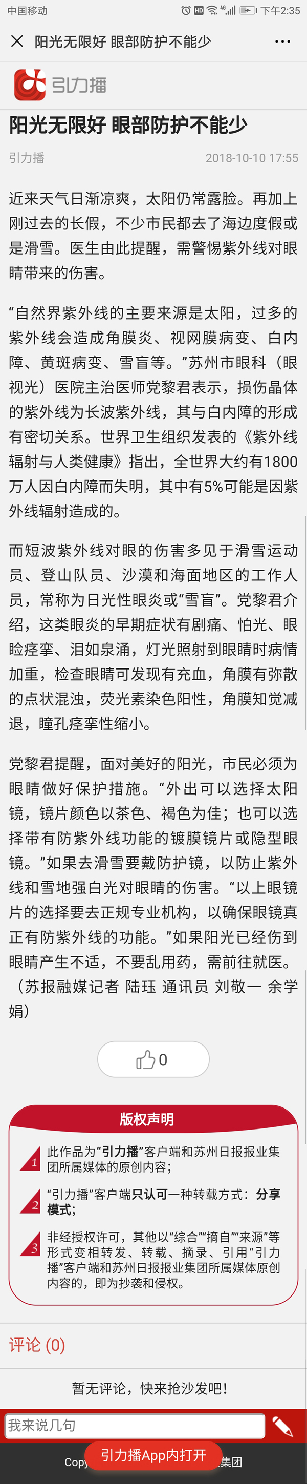 “自然界紫外线的主要来源是太阳,过多的紫外线会造成角膜炎、视网膜病变、白内障、黄斑病变、雪盲等。”苏州市眼科(眼视光)医院主治医师党黎君表示,损伤晶体的紫外线为长波紫外线,其与白内障的形成有密切关系。世界卫生组织发表的《紫外线辐射与人类健康》指出,全世界大约有1800万人因白内障而失明,其中有5%可能是因紫外线辐射造成的。而短波紫外线对眼的伤害多见于滑雪运动员、登山队员、沙漠和海面地区的工作人员,常称为日光性眼炎或“雪盲”。党黎君介绍,这类眼炎的早期症状有剧痛、怕光、眼睑痉挛、泪如泉涌,灯光照射到眼睛时病情加重,检查眼睛可发现有充血,角膜有弥散的点状混浊,荧光素染色阳性,角膜知觉减退,瞳孔痉挛性缩小。