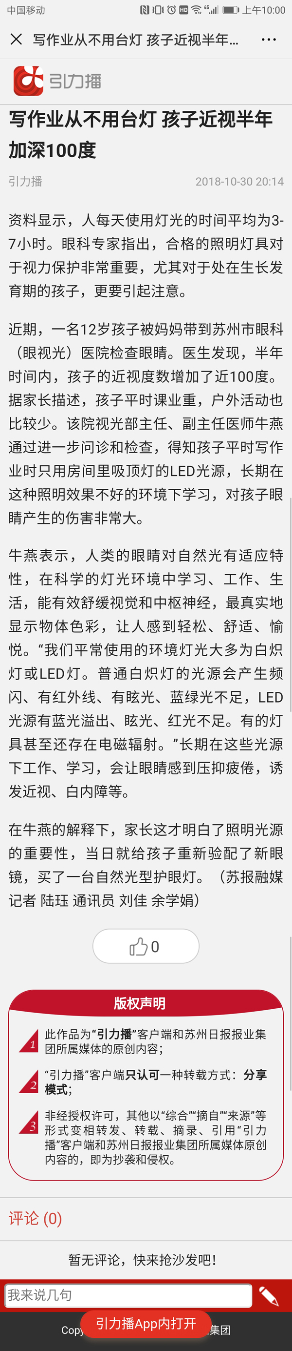近期,一名12岁孩子被妈妈带到苏州市眼科(眼视光)医院检查眼睛。医生发现,半年时间内,孩子的近视度数增加了近100度。据家长描述,孩子平时课业重,户外活动也比较少。该院视光部主任、副主任医师牛燕通过进一步问诊和检查,得知孩子平时写作业时只用房间里吸顶灯的LED光源,长期在这种照明效果不好的环境下学习,对孩子眼睛产生的伤害非常大。