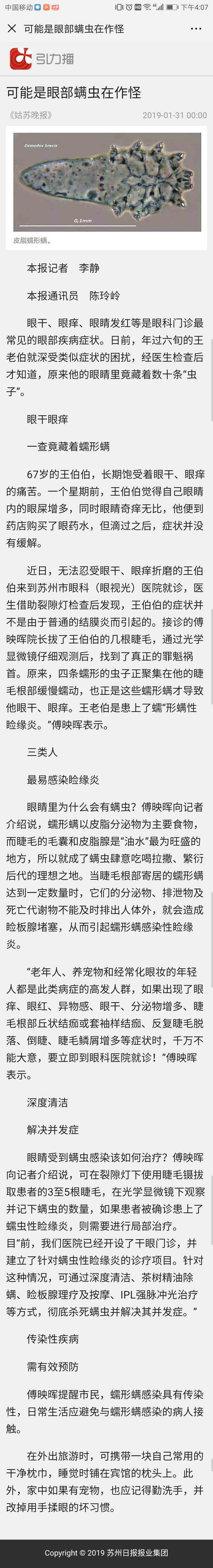 近日,无法忍受眼干、眼痒折磨的王伯伯来到苏州市眼科(眼视光)医院就诊,医生借助裂隙灯检查后发现,王伯伯的症状并不是由于普通的结膜炎而引起的。接诊的傅映晖院长拔了王伯伯的几根睫毛,通过光学显微镜仔细观测后,找到了真正的罪魁祸首。原来,四条蠕形的虫子正聚集在他的睫毛根部缓慢蠕动,也正是这些蠕形螨才导致他眼干、眼痒。王老伯是患上了蠕“形螨性睑缘炎。”傅映晖表示。