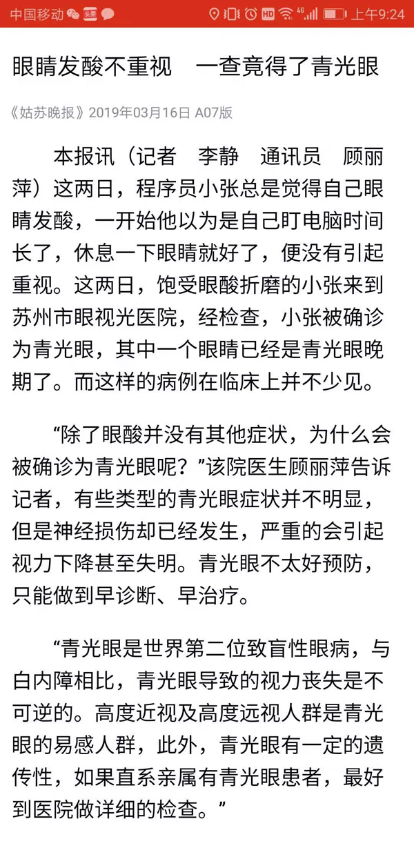 《姑苏晚报》眼睛发酸不重视 一查竟得了青光眼