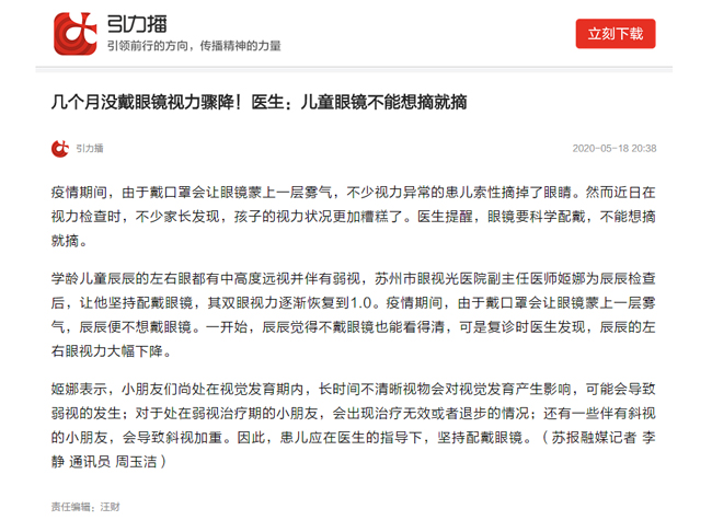 学龄儿童辰辰的左右眼都有中高度远视并伴有弱视,苏州市眼视光医院副主任医师姬娜为辰辰检查后,让他坚持配戴眼镜,其双眼视力逐渐恢复到1.0。疫情期间,由于戴口罩会让眼镜蒙上一层雾气,辰辰便不想戴眼镜。一开始,辰辰觉得不戴眼镜也能看得清,可是复诊时医生发现,辰辰的左右眼视力大幅下降。