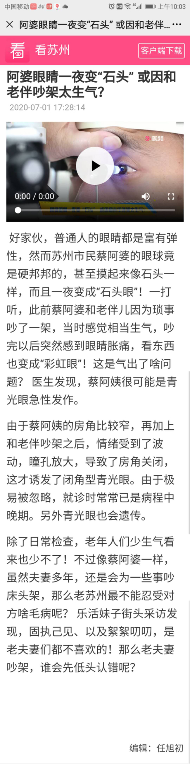 好家伙,普通人的眼睛都是富有弹性,然而苏州市民蔡阿婆的眼球竟是硬邦邦的,甚至摸起来像石头一样,而且一夜变成“石头眼”!一打听,此前蔡阿婆和老伴儿因为琐事吵了一架,当时感觉相当生气,吵完以后突然感到眼睛胀痛,看东西也变成“彩虹眼”!这是气出了啥问题?医生发现,蔡阿姨很可能是青光眼急性发作。