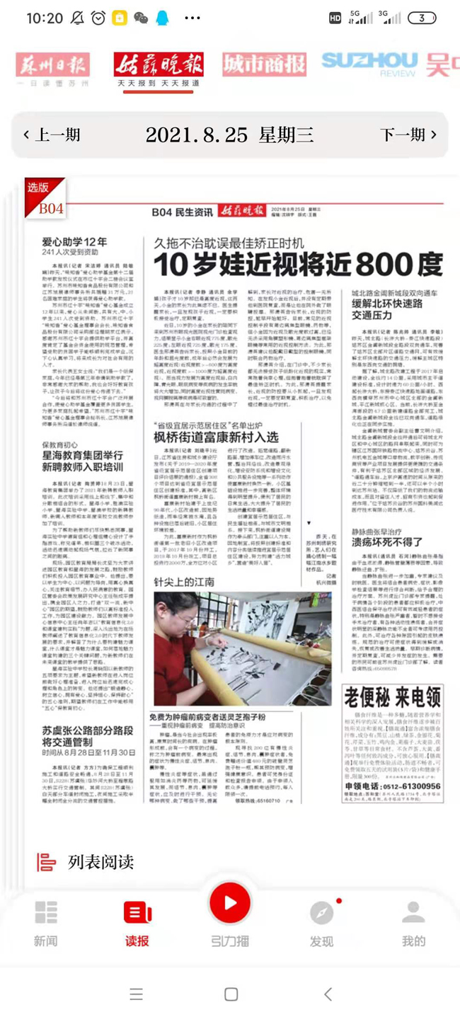 近日,10岁的小金在家长的陪同下来到苏州市眼视光医院视光门诊检查视力,结果显示小金右眼近视775度,散光225度;左眼近视725度,散光175度。该院医生邢潇英告诉家长,按照小金目前的年龄和屈光度数,成年后必然会发展为超高度近视(近视度数>-600度为高度近视,近视度数>-1000度为超高度近视)。而当视力发展为高度近视后,白内障、青光眼、眼底病变等疾病的发生率就将大大增加,同时高度近视性黄斑病变、视网膜脱离等疾病是可致盲的。