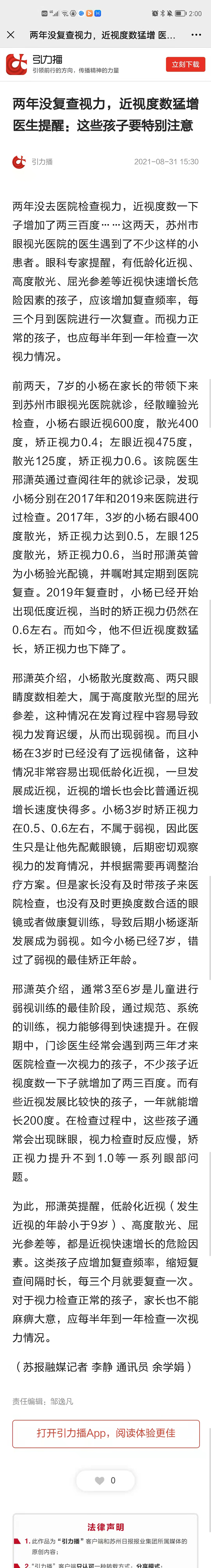 两年没去医院检查视力,近视度数一下子增加了两三百度……这两天,苏州市眼视光医院的医生遇到了不少这样的小患者。眼科专家提醒,有低龄化近视、高度散光、屈光参差等近视快速增长危险因素的孩子,应该增加复查频率,每三个月到医院进行一次复查。而视力正常的孩子,也应每半年到一年检查一次视力情况。