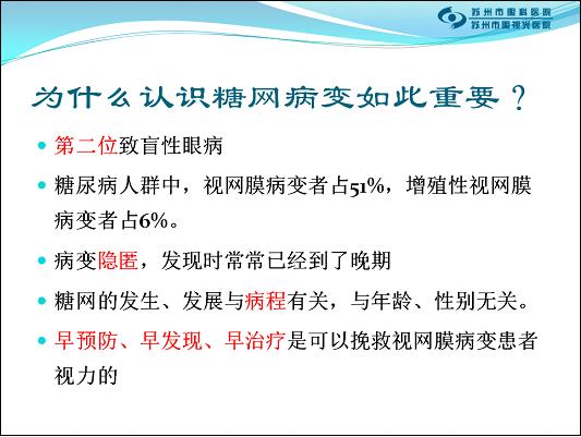 糖尿病性视网膜病变(以下简称“糖网”)是目前世界排名第二位的致盲眼病,由于这个病非常的隐匿,患者往往到了晚期才会发现,而那时大多数人的视力都已经受到了不同程度的影响。因此早预防、早发现、早治疗对糖尿病患者是非常重要的。
