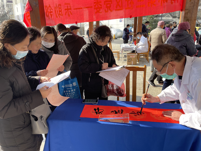 活动现场,眼视光医院公益服务团队组成了一道独特的风景线,我院医务部副主任吴作志医生为社区老人们提供眼科健康检查和咨询,他为社区老人们解答眼部相关的问题,并向老人们宣传眼科保健知识。我院党员同志王礼明作为写春联的志愿者,挥毫泼墨,将对社区居民们最美好的祝福融入一幅幅现场书写的春联中。