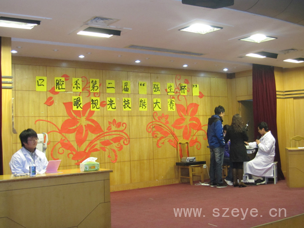 第二届“强生杯”眼视光技能大赛介于2010年12月20日在第一报告厅隆重举行,莅临嘉宾有:眼视光医院副院长贾松、眼视光医院副院长黄小明、口腔系书记朱晓飞、眼视光医院党委书记李敏、眼视光医院门诊主任牛燕、眼视光医院门诊医生吴小娜、眼视光医院门诊医生陈志平、口腔系团委书记顾安、口腔系辅导员金丽芬。