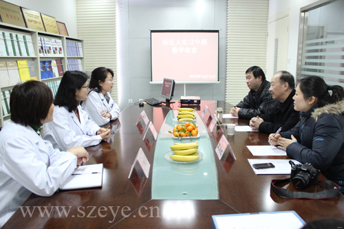 贾松副院长介绍了眼视光医院对南医大实习生的实习带教工作以及在我院实习的南医学生情况,带教老师和实习生组长分别汇报了带教和实习情况,最后薛院长对三位实习生进行了理论与实践操作的全方位考核。我院认真细致、严格规范的实习带教工作得到了南医大各位领导的一致好评。