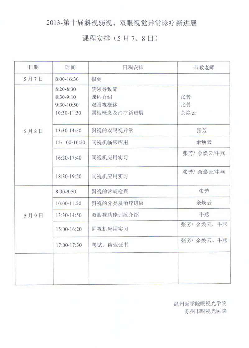 为促进斜弱视学科发展,提高眼科医生对斜视弱视,特别是对其早期诊断的认识,普及斜弱视治疗理念,规范治疗方法。由温州医学院眼视光学院、苏州市眼视光医院与苏州六六视觉科技股份有限公司联合举办国家继续医学教育基地项目J50-13-08 “斜视弱视、双眼视觉基础与临床培训”,于2013年5月7日-5月10日在苏州举办。温州医学院附属眼视光医院斜弱视张芳 副主任医师等教学团队将给予授课,学员通过考核后可获得国家级I类继续教育学分5分。