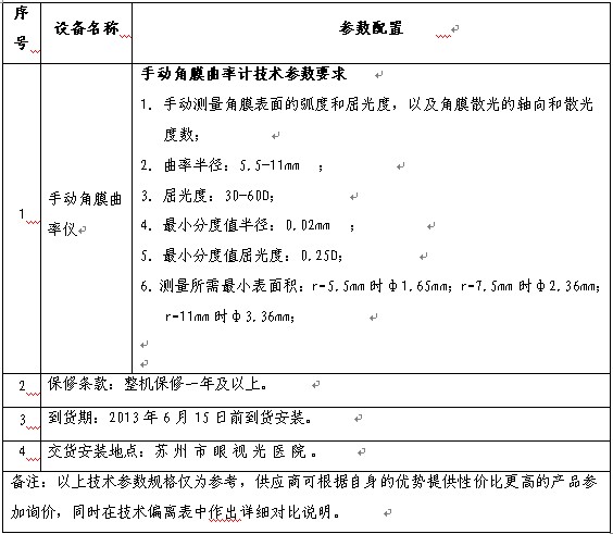 苏州市眼视光医院拟采购手动角膜曲率仪一台,参照《中华人民共和国政府采购法》等有关规定,现特向社会公开询价采购,欢迎具备独立法人资格的相关单位前来报价。