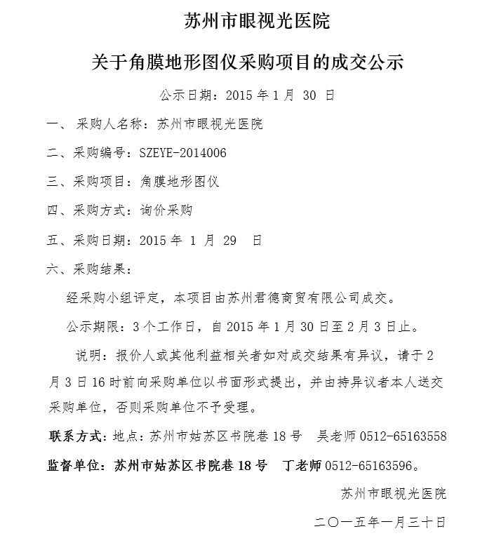 苏州市眼视光医院关于角膜地形图仪采购项目的成交公示