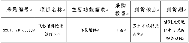 苏州市眼视光医院拟采购飞秒眼科激光治疗仪,参照《中华人民共和国政府采购法》、《政府采购货物和服务招标投标管理办法》等有关规定,现采用竞争性谈判方式进行(非政府采购),欢迎合格的供应商前来谈判。