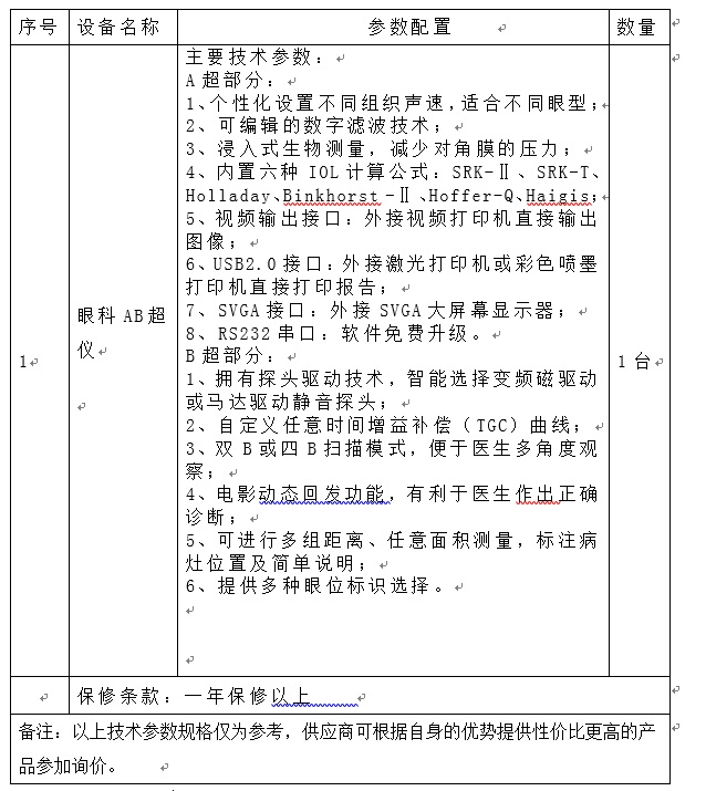 苏州市眼视光医院拟采购眼科AB超仪设备一台,根据《中华人民共和国政府采购法》等有关规定,现特向社会公开询价采购,欢迎具备独立法人资格的相关单位前来报价。