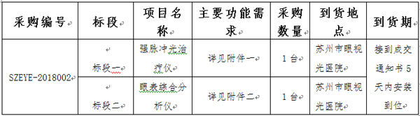 苏州市眼视光医院拟采购强脉冲光治疗仪、眼表综合分析仪各一台,参照《中华人民共和国政府采购法》、《政府采购货物和服务招标投标管理办法》等有关规定,现采用竞争性谈判方式进行(非政府采购),欢迎合格的供应商前来谈判。